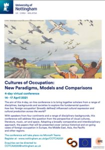 The aim of this 4-day, on-line conference is to bring together scholars from a range of disciplines, backgrounds and societies to explore the fundamental question: how has ‘foreign occupation’ (broadly defined) influenced cultural expression and cultural production across the world? With speakers from four continents and a range of disciplinary backgrounds, this conference will address this question from the perspective of visual cultures, literature, music, art and space. Adopting a broadly comparative and interdisciplinary approach, the papers that will be presented cover various historical and on-going cases of foreign occupation in Europe, the Middle East, Asia, the Pacific and other regions.