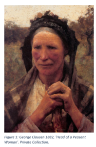Keen to portray Britain as a civilised nation, the political elite of the late nineteenth century defined the parameters of respectable female behaviour by drawing on literature from the mid-nineteenth century such as the journal All the Year Round, which condemned female land work by announcing that it ‘turned girls into demons’.[2] The nature of the work challenged the middle class ideal of exemplary feminine behaviour due to the women’s exposure to vulgar language and perceived gross sexual immorality which turned them into ‘brutes in soul and manners’.[3] Artist George Clausen, portrayed the reality of the effect of farm work on women in his painting, Head of a Peasant Woman. Her careworn face and grimed fingernails portrayed the harshness of agricultural work.