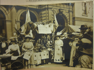 Fast forward to 15 October 2021, when an email arrived from Dr Sue Jones, author of Votes for Women: Cheltenham and the Cotswolds[3]. She’d been to the Museum of London some years ago to see Ada Flatman’s scrapbooks[4], and had recently seen online about my lack of success to find Ethel. I’m incredibly grateful as Sue had solved my dilemma: there was indeed a photograph of the 1912 May Fair, but as the names were on the back, I’d not seen them online during my lockdown research. So there is Ethel, Ada, George, Molly in her perambulator, and a crowd of people surrounding the WSPU stall. I could be satisfied that I had finally found Ethel.