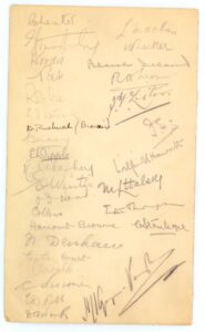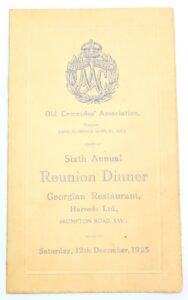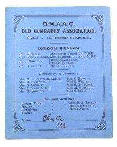 Emmie was associated with the Queen Mary’s Army Auxiliary Corps (QMAAC) ‘Old Comrades Association’ in the 1920s (in 1918 the WAAC was renamed the QMAAC). Emmie kept a London Branch ‘Programme of Events for 1925’. She likely attended the ‘Sixth Annual Reunion Dinner’ (1925), for on the reverse of the menu from the event are collected signatures, including Emmie’s. As the historian Jane Clarke has noted, women were to ‘reunite’ and ‘share and celebrate memories of their wartime service’ through the ‘social spaces’ of the Old Comrades Association’s journal and local and national events and activities.[6] These were spaces for Clarke where veteran and ex-servicewomen identities were fostered, performed and presented and ‘domestic roles, marital relationships and maternal identities could be temporarily relegated’.[7]
