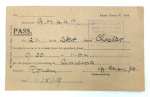 Although the suitcase is frustratingly silent on Emmie at work, it is contrastingly rich on her time away from it. Despite timed restrictions on travel during leisure hours, Emmie sought an active social and cultural life, especially through leave, evidenced through a cinema pass, dance cards and theatre and exhibition programmes. She developed a friendship group with seven WAAC colleagues, nicknamed ‘The Blighty Girls’ and whose bond with several carried through strongly into later life.
