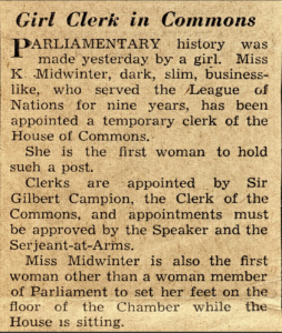 Appointed specifically to free up a man for war service, the ‘Girl Clerk’ as she was termed in the press – although she was aged 32 – worked for the House of Commons National Expenditure Committee. Unlike any other female member of staff in Parliament to date, her background was in international relations, with nearly ten years’ experience working for the League of Nations in Geneva. At the point she joined them, the League had enjoyed some successes in resolving international disagreements during the 1920s. Midwinter reflected many years later that ‘this promised a life career in a worthwhile cause, that of helping to preserve peace in the world.’