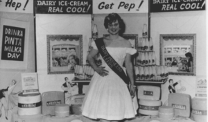 We were going to enjoy learning about Wool Queens, Gas Queens, Coal Queens, Railway Queens. From the 1920s to the 1980s these grass-roots human beings were units in advertising campaigns to boost consumer consumption in their industries. Celia had been the National Milk Publicity Council’s Dairy Maid of Huddersfield 1960. She rose to become the 1960 Dairy Princess of Leeds, where her roles included milking a cow on Leeds Town Hall steps and opening the Wimpy Bar in Halifax. Judges elected winners on the basis of ‘the most healthy appearance, natural attractiveness, speech and personality, and will take into consideration any association with, or knowledge of farming or the dairy industry’ said the publicity flyer.