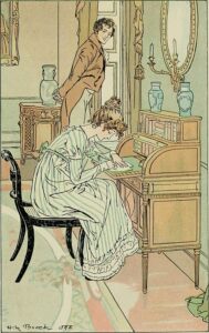 Further proof of letter writing’s critical importance to British women’s lives in the nineteenth century is found within the pages of Austen’s novels. Both Mansfield Park and Emma make significant references to the value of correspondence in young women’s lives. In Mansfield Park, when a young Fanny Price is removed from her home and placed in the care of her aunt and uncle, she becomes endlessly devoted to her cousin after he provides her with ink and paper so that she might correspond with her brother. The means to write a letter completely changes the character’s sense of agency and well-being.