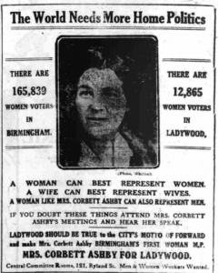 100 years ago, on 14 December 1918, women in Britain went to the polls to vote in a General Election for the first time. Just ten months after the Representation of the People Act had awarded the franchise to some women (those over thirty, who met a property qualification), the newly-expanded electorate cast their first ballots. As part of my doctoral research, I have been investigating how women in and around Birmingham reacted to the extension of the franchise. In this election, the city and surrounding districts saw three women stand as parliamentary candidates: Margery Corbett Ashby, Liberal candidate for Birmingham Ladywood; Christabel Pankhurst, Women’s Party candidate for Smethwick, and Mary Macarthur, Labour candidate for nearby Stourbridge. Although none were successful, theprospect of potentially being able to vote for one of these three women, who were among the first to stand nationwide, does seem to have excited some local women, whileothers remained distinctly unenthused. Several Birmingham newspapers, including the Birmingham Mail,reported on 15 December 1918 that a Mrs Fanny Vince claimed to be the first woman in Birmingham to vote: at 7am, she had been found outside her polling station, waiting for it to open. But the Birmingham Mailalso recorded that an unnamed ‘old lady’, who, when asked whether she had voted, responded: ‘Well, my dear, I never have voted and I ain’t goin’ to start now at my time o’ life.’