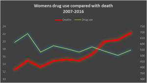 The data on drug-related deaths shows that 31% of female deaths was “intentional”, compared with 17% of male deaths, but there has been very little analysis or exploration into why this phenomenon is occurring.
