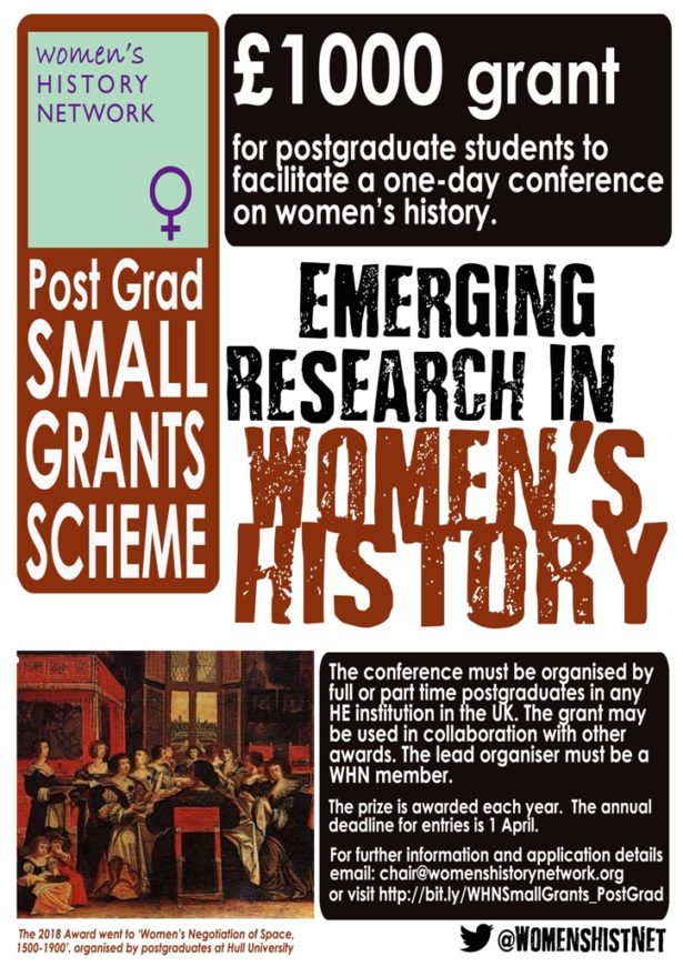 Enquiries about the Small Grants Postgraduate Scheme may be sent to Maggie Andrews, the Chair of the WHN and submissions made electronically to: chair@womenshistorynetwork.org
